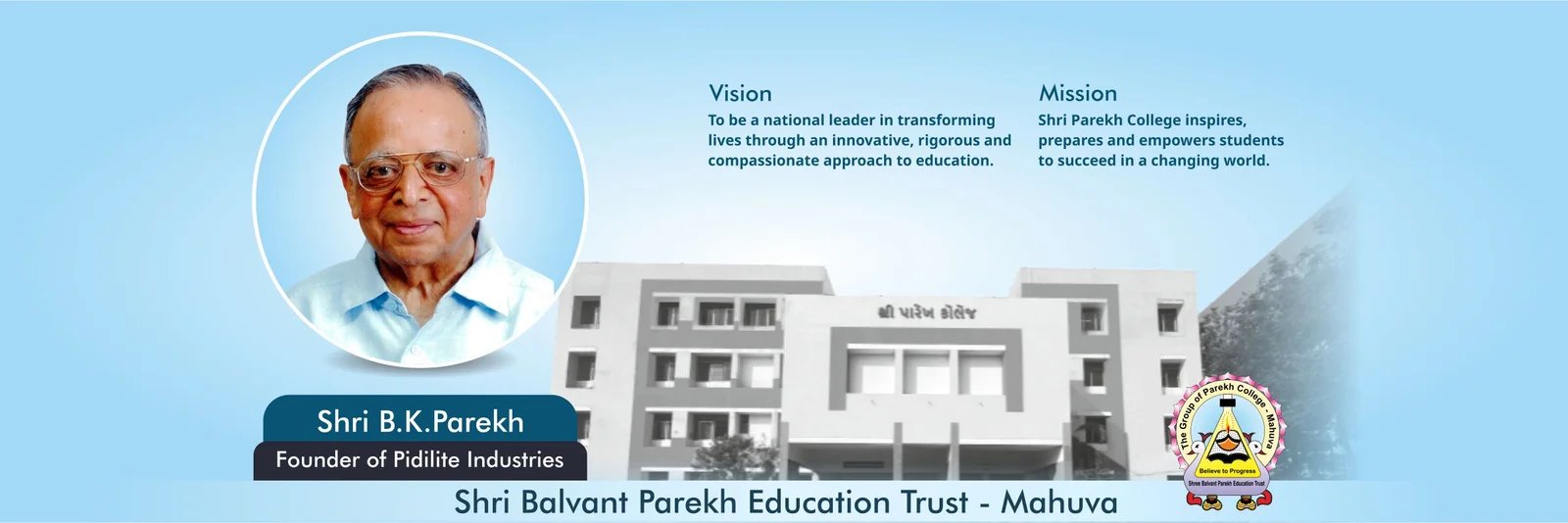with the vision of fulfilling the dream of providing SCIENCE EDUCATION to thousands of youth in educationally backward and rural area established Shri Kalyanaji Valji Parekh Science College and T.K Parekh Arts College in the year 1966 under the management of Shree Mahuva Education Trust. With a picturesque campus on nearly 6 acres (5.564) of land in the lap of nature ended a truly materialized dream of him and Shree Mahuva Education Trust, and to strengthen the vision and mission for providing higher education, different colleges were added in succession at different intervals. To honor the kindheartedness and with the wish of many, In the year 2019 Shree Mahuva Education Trust was renamed as Shree Balvant Parekh Education Trust. The Trust is registered under Trust Reg. No E-1016/Bhavnagar.