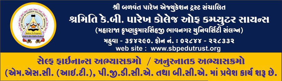 We marching towards the completion of give decades Smt. K. B. Parekh College of Computer Science, Mahuva with the constituents, are a family of some 20 staff member faculty 450 students being educated at undergraduate and postgraduate levels in Computer Science discipline. With a picturesque campus on nearly 6 acres (5.564) of land in the lap of nature, Smt. K. B. Parekh College of Computer Science, Mahuva, affiliated to Maharaja Krishnakumarsinhji Bhavnagar University, is ended a truly materialized dream of Shree Mahuva Education Trust, which commenced its mission of higher education in a rural and educationally backward region – Mahuva in 2000.